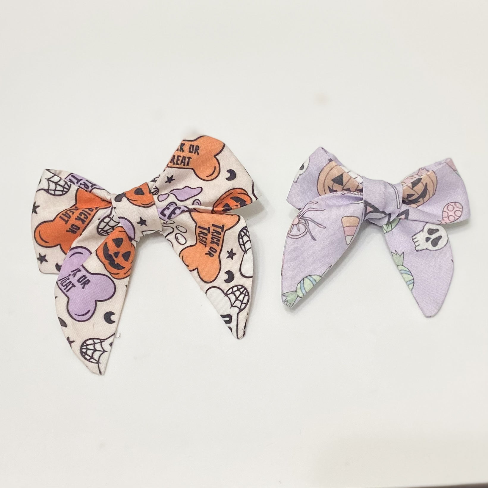 Halloween sailor dog bow with purple and orange bones. Spooky messages and detailing like cobwebs will have your dog saying “just treats” all trick-or-treat season.