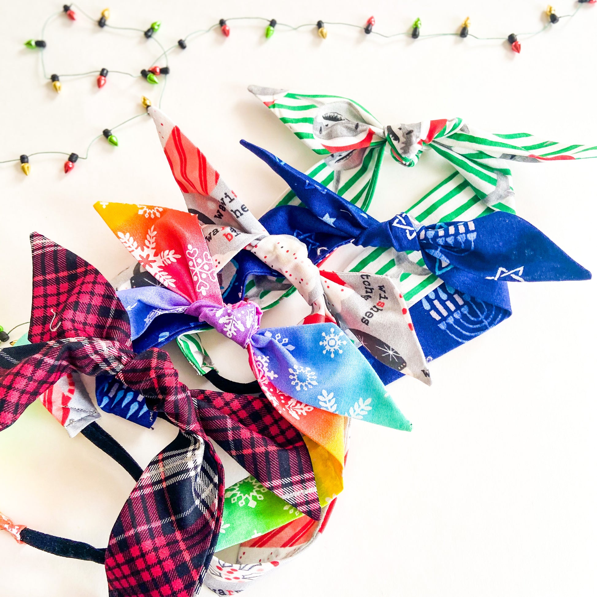 Top-knot headbands come in two sizes for pups, and one size for humans! The headbands are made from coordinating bandana fabrics, and are finished with super comfortable nylon bands for and close, comfortable fit.