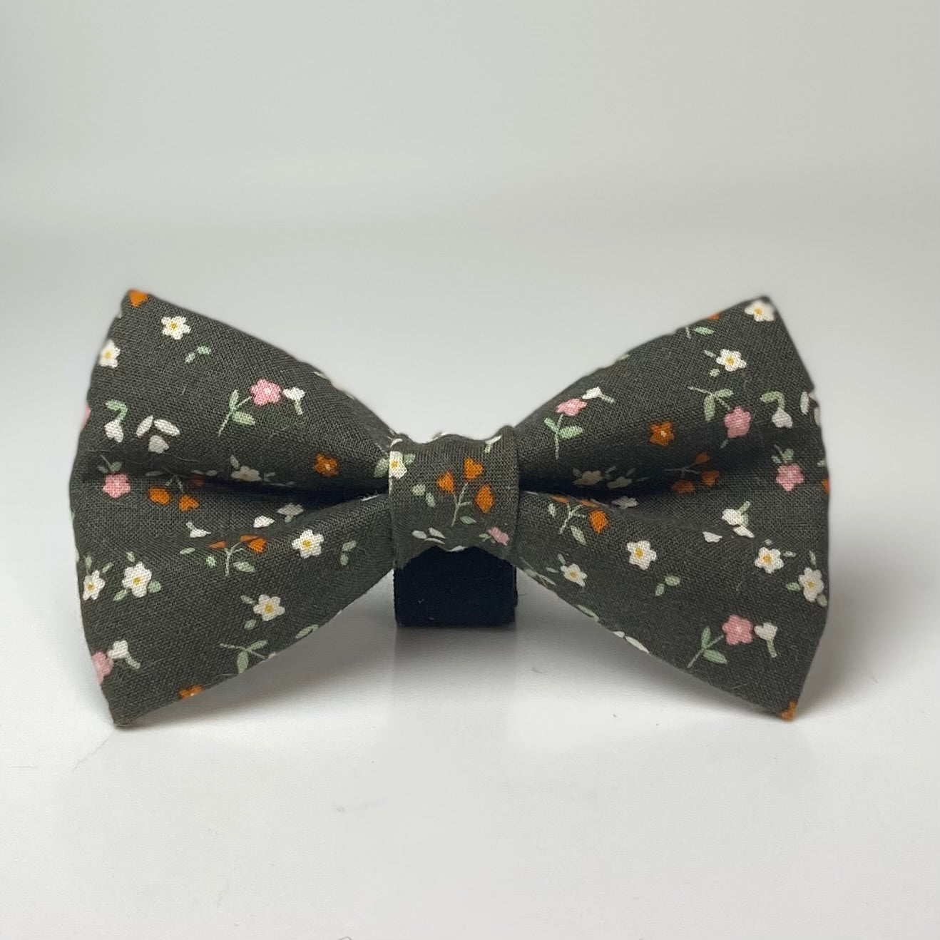 Dog bow in a deep moss green background that contrasts with bitty rust and pink flowers sprinkled about. Coordinating collar also pictured.