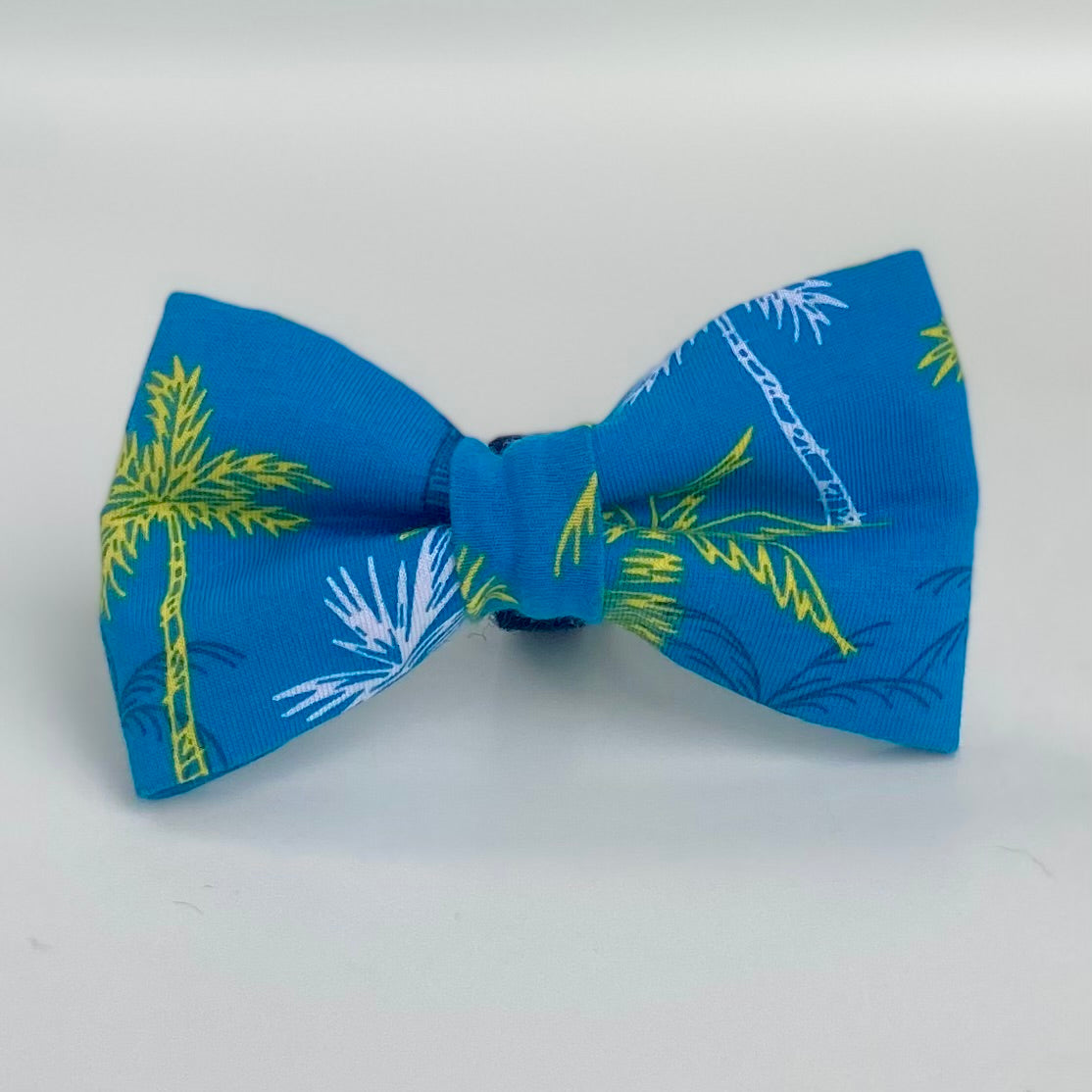 Dog bow tie with neon yellow and white palm trees on a bright blue background.