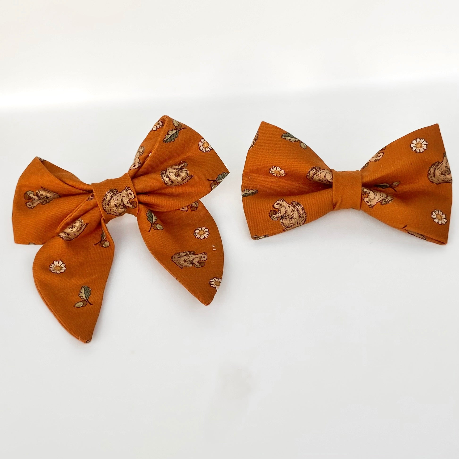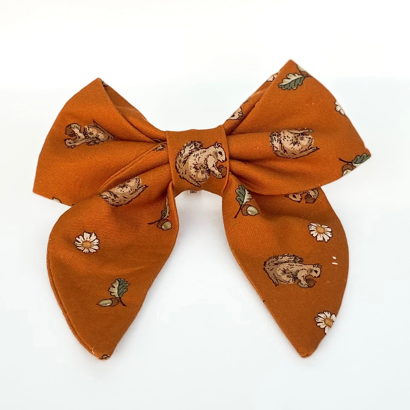 Fall dog sailor bow with a rich, pumpkin background and plump squirrels working on their fall harvest. Squirrels holding acorns, acorn leaves, and daisies gather across this modern meets retro print.