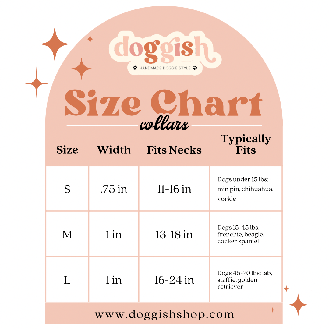 Fabric collars are available in a range of sizes from 15 inches to 28 inches. See size chart in photos to see which size will be best fit for your dog.